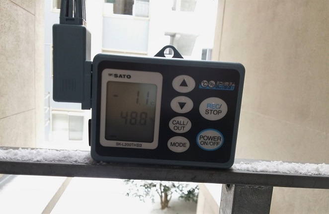 気温と湿度を自動的に計測するロガー(記録計)です。写真は長崎市で観測史上最大の積雪深を記録した日に撮影しました。秋田出身の私でも厳しい寒さでした。