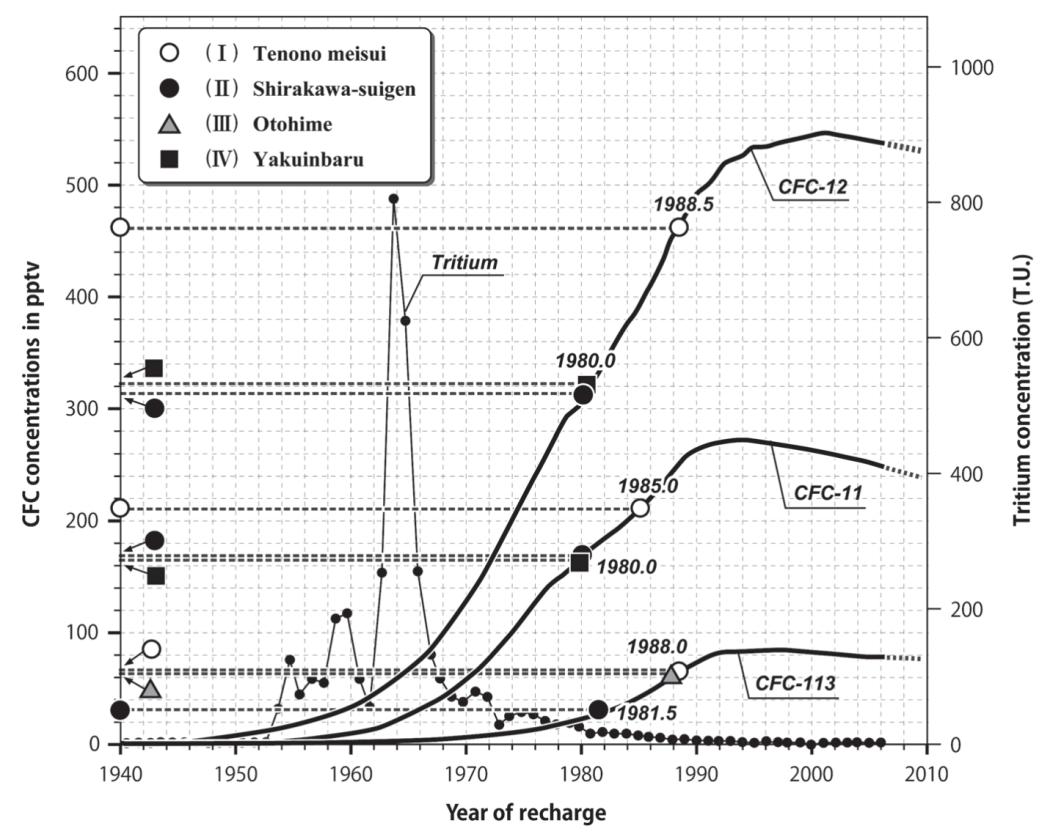 CFCsを用いた地下水の年齢推定は、測定された地下水中のCFCs濃度から(既知の溶解度と涵養温度の関係(ヘンリーの法則)を用いて)地下水が涵養された時の大気濃度を求め、その値を過去の大気のCFCs濃度曲線と対比することによって得ることができます。つまり、地下水に溶存するCFCs濃度は、いつの時代の大気濃度と等しいか?と判断することで、涵養年を推定し滞留時間を求めます。例を図3に示します。ここでは4地点の湧水試料のCFCs濃度を測定し、いつ涵養したのかを推定しています。この「CFCs」と前述したトリチウムを用いて年齢を推定した具体的な事例として、阿蘇カルデラ内の湧水で行われた研究などがあります(利部ほか,2011)。例えば白川水源では約35年の年齢を有することが判明しました。