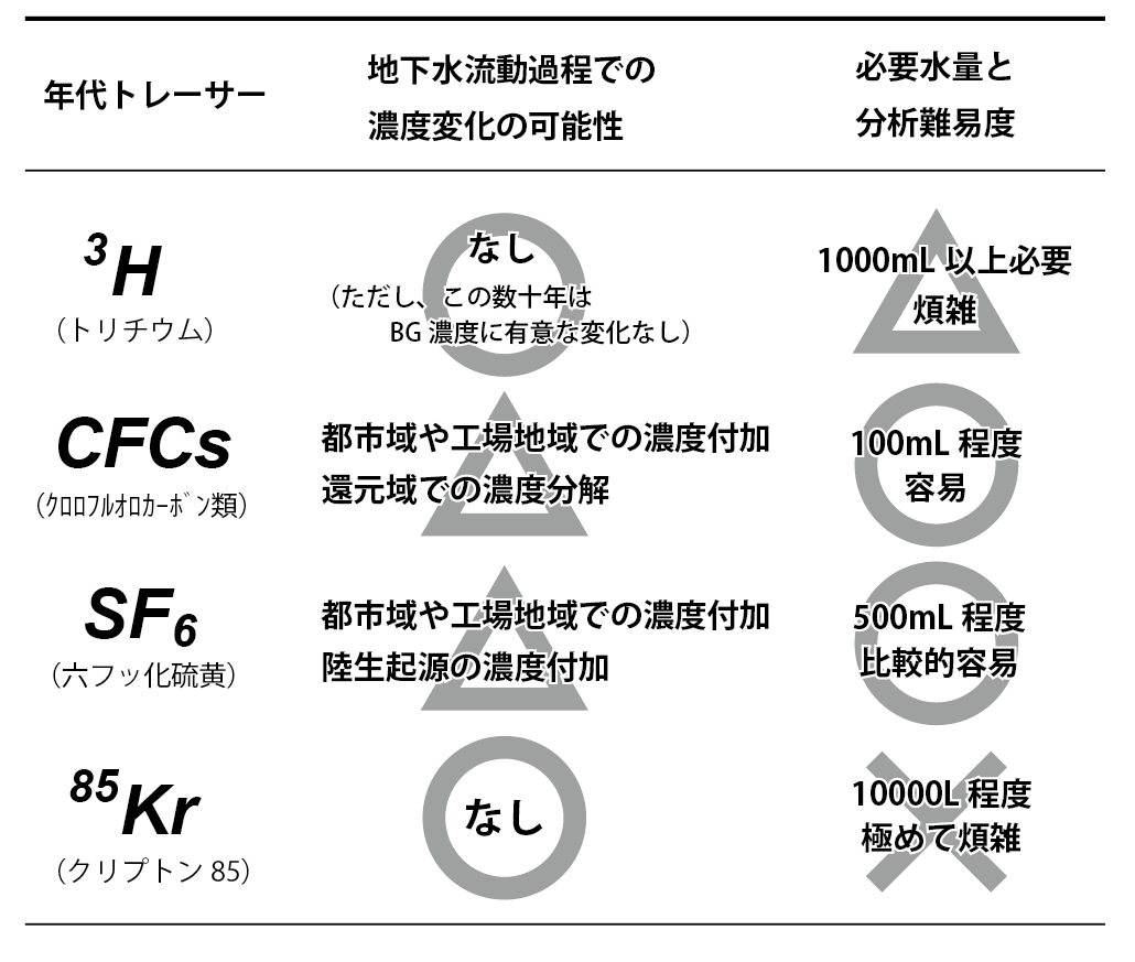 ここには、「若い地下水」・「古い地下水」・「非常に古い地下水」のそれぞれの年齢を測定することが得意なトレーサーが示されています。