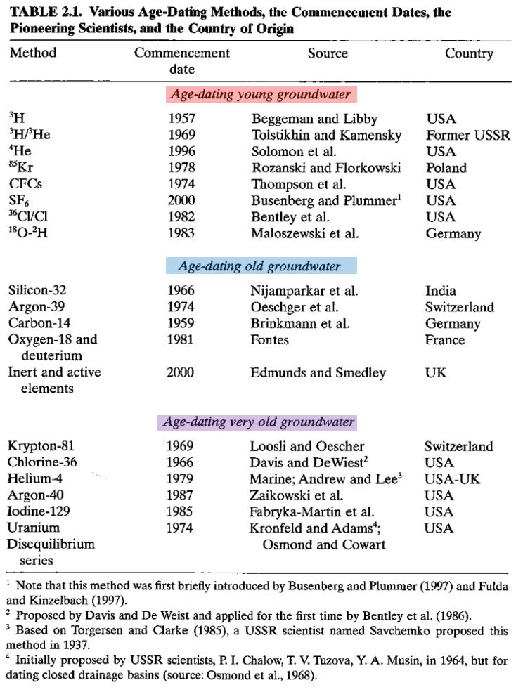 これまで世界の多くの研究者により、地下水年齢の推定のために数多くのトレーサーの適用可能性が研究されてきました。以下の表1をご覧ください。Method欄がトレーサーの種類を示しています。