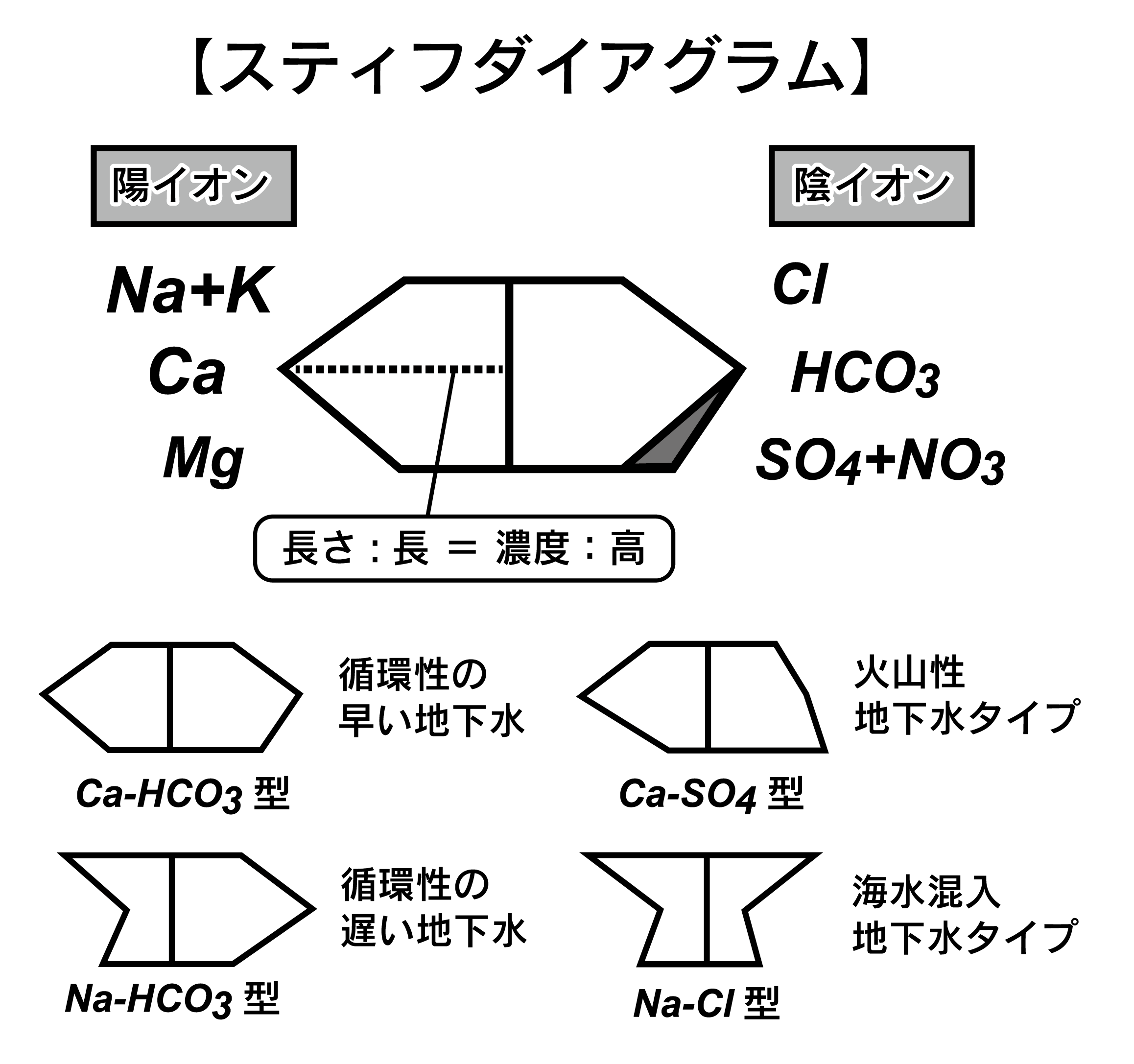 分析された水試料の水質特性は、水質成分項目の濃度の多少や比較による特徴から把握されます。また、多地点の分析結果の数値を互いに比較するのは困難な場合があるため、直感的に水質特性を把握するために図形化して示される場合があります。その図の1つがスティフダイアグラムです。